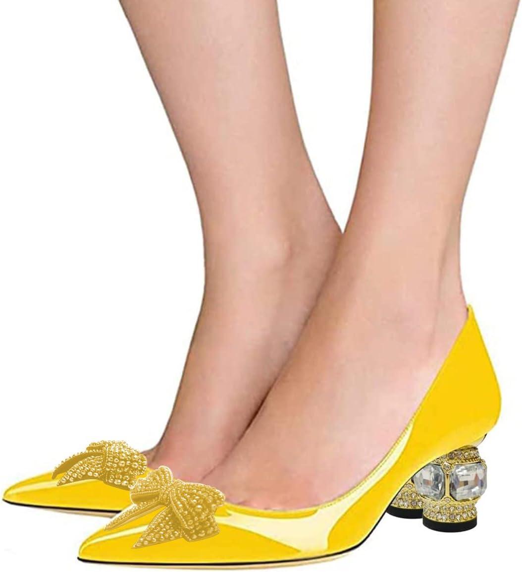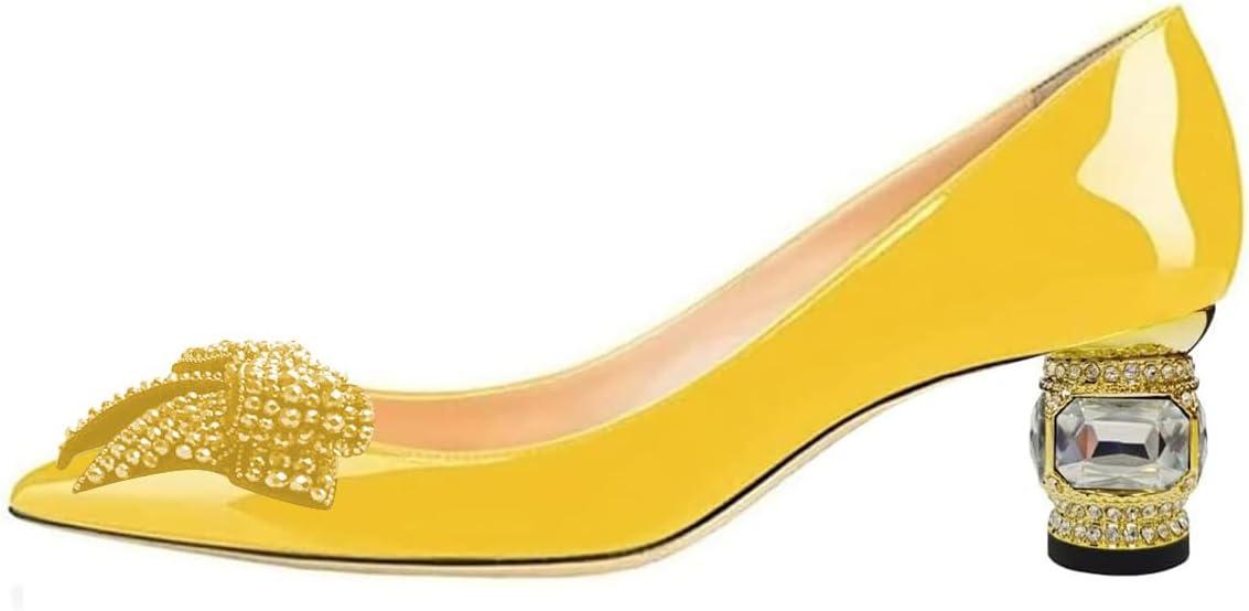 FSJ Women Pointed Toe Crystal Pump Rhinestone Bow Block Low Heel Slip On Comfy Date Party Shoes Size 4-16 US(Yellow)