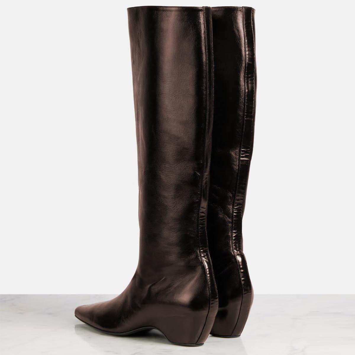 FSJ Women Pointed Toe Knee High Wedge Boots Sleek Mid Heel Pull On Tall Boots Comfort Daily Wear Shoes Size 4-16 US(Brown)