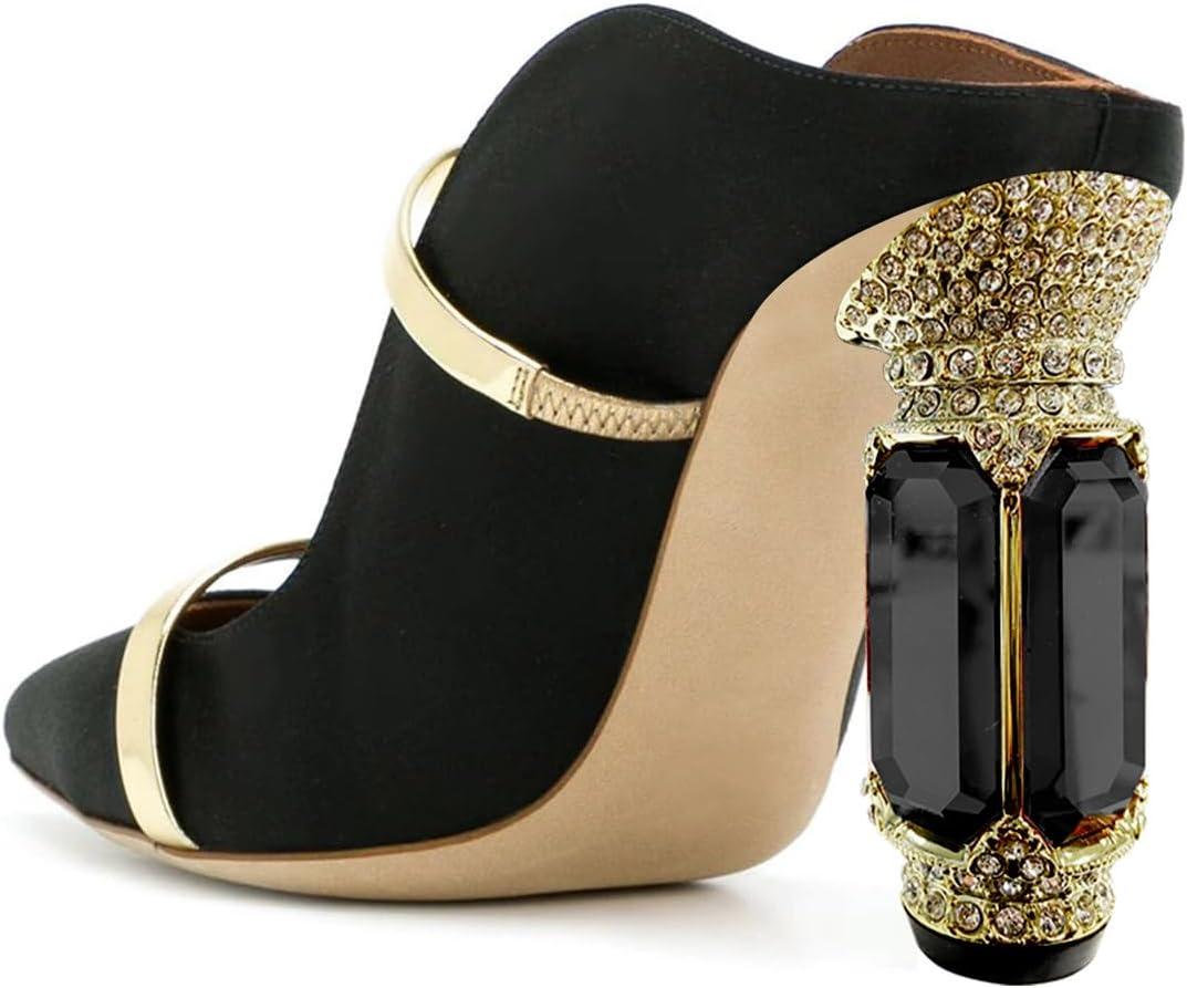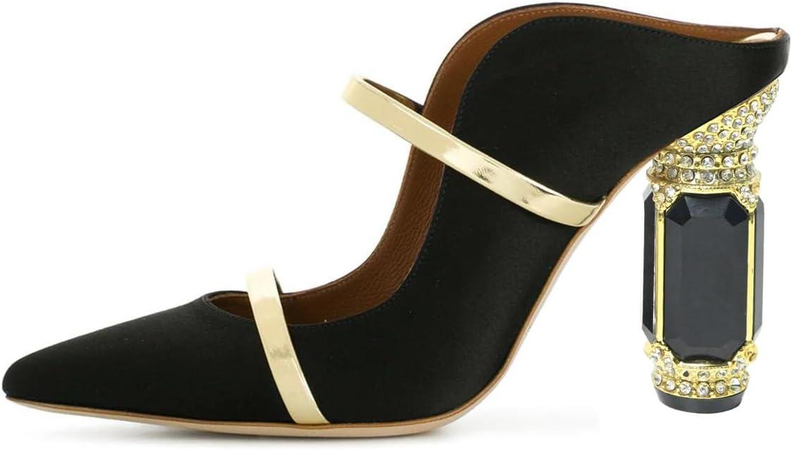 FSJ Women Pointed Toe Mules Chunky High Heels Sandals Pumps Slip On Two Strap Chic Crystal Block Heels Backless Casual Dressy Shoes Size 4-16 US(Black Satin)