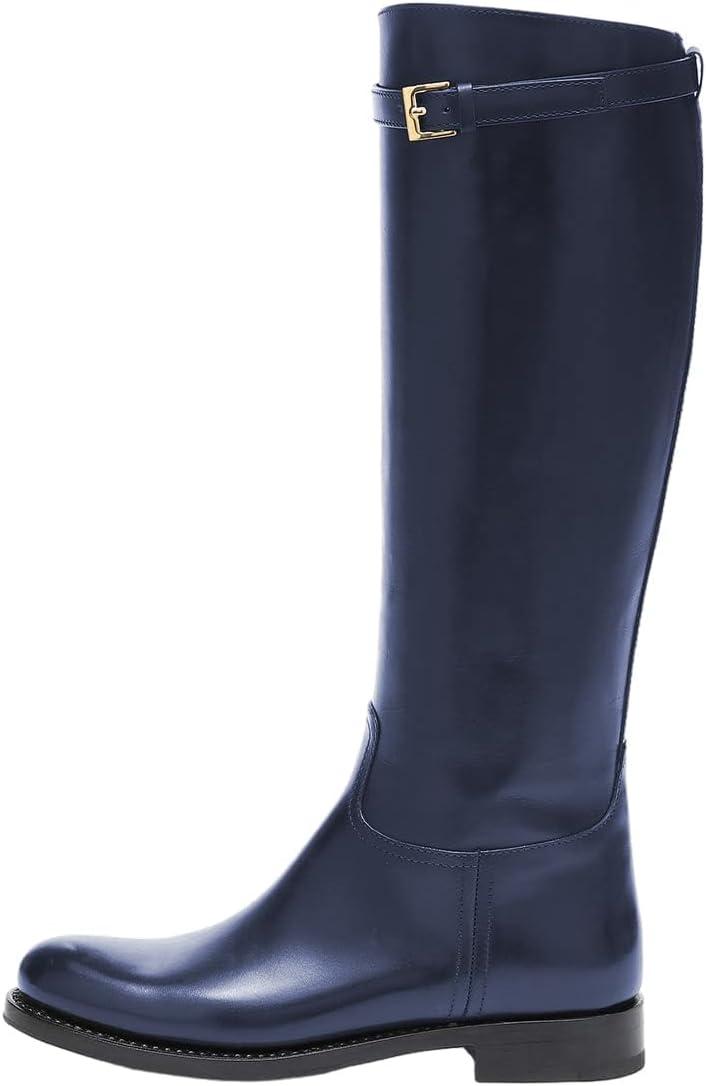 FSJ Women Regular Round Toe Flats Riding Knee High Boots Wide Calf Buckled Strappy Chunky Low Heel Western Long Boots Size 4-15 US(Navy Blue)