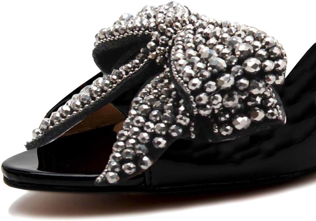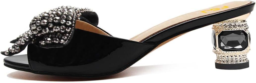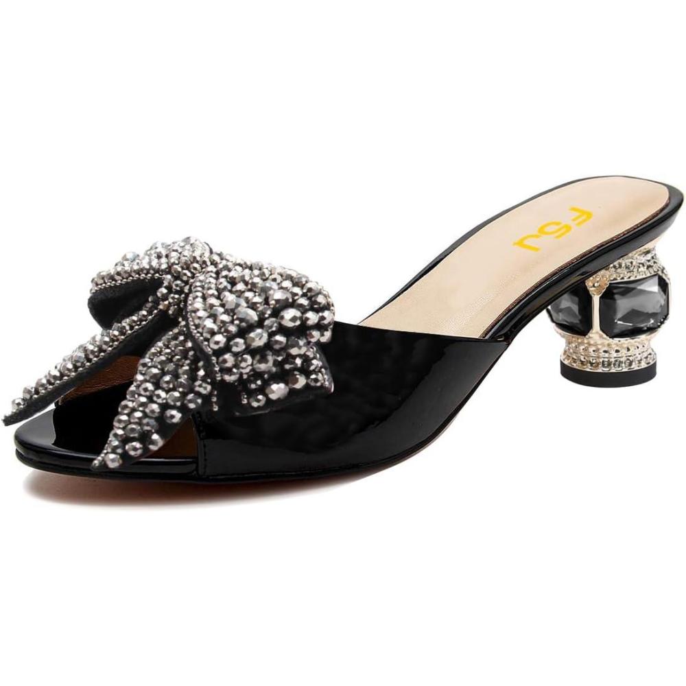 FSJ Women Rhinestone Bow Low Heel Mule Sandals Peep Toe Crystal Block Heel Slipper Shoes for Comfort Wedding Slides Size 4-16 US(Black Low Heel)