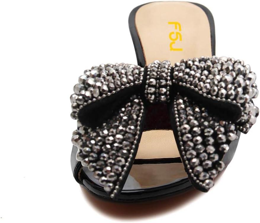 imageFSJ Women Rhinestone Bow Low Heel Mule Sandals Peep Toe Crystal Block Heel Slipper Shoes for Comfort Wedding Slides Size 416 USBlack Low Heel