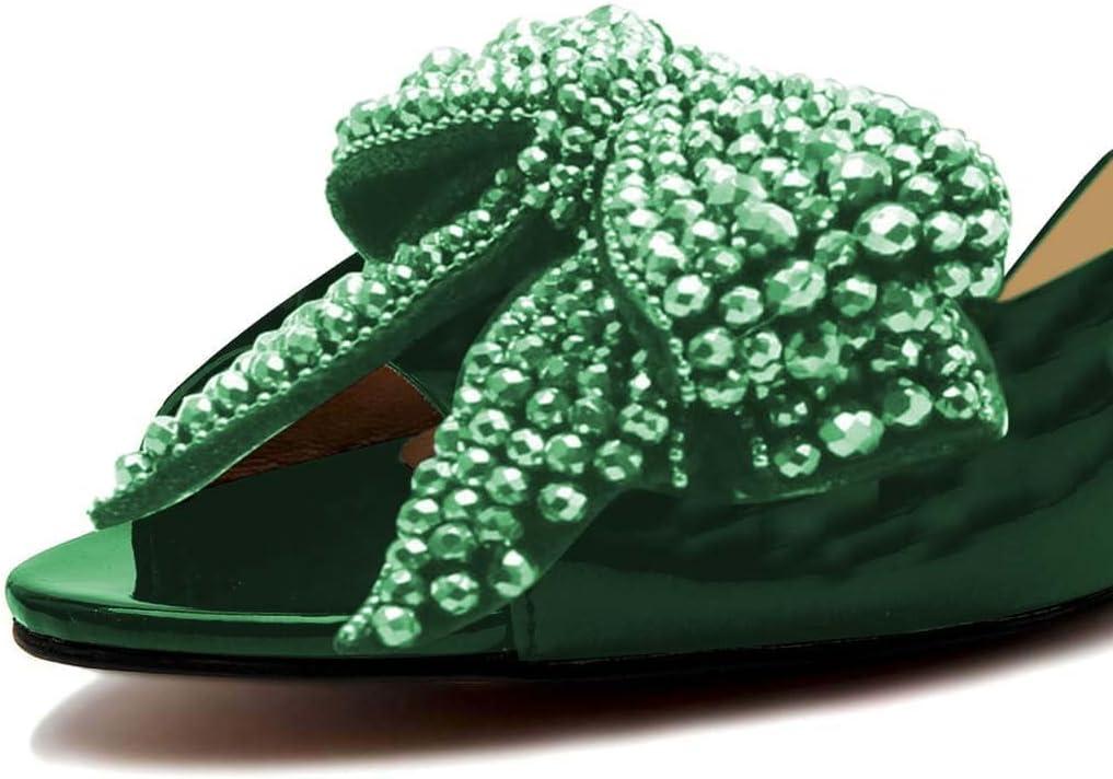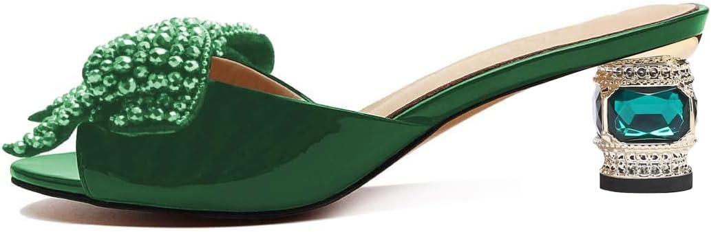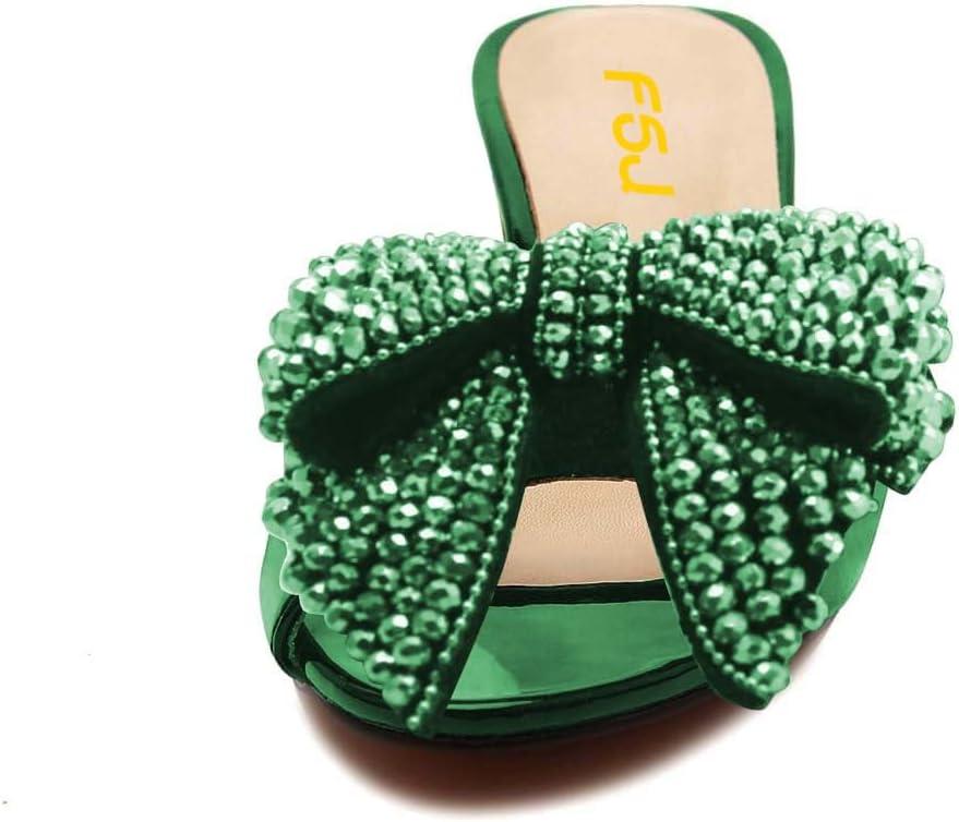 FSJ Women Rhinestone Bow Low Heel Mule Sandals Peep Toe Crystal Block Heel Slipper Shoes for Comfort Wedding Slides Size 4-16 US(Green Low Heel)