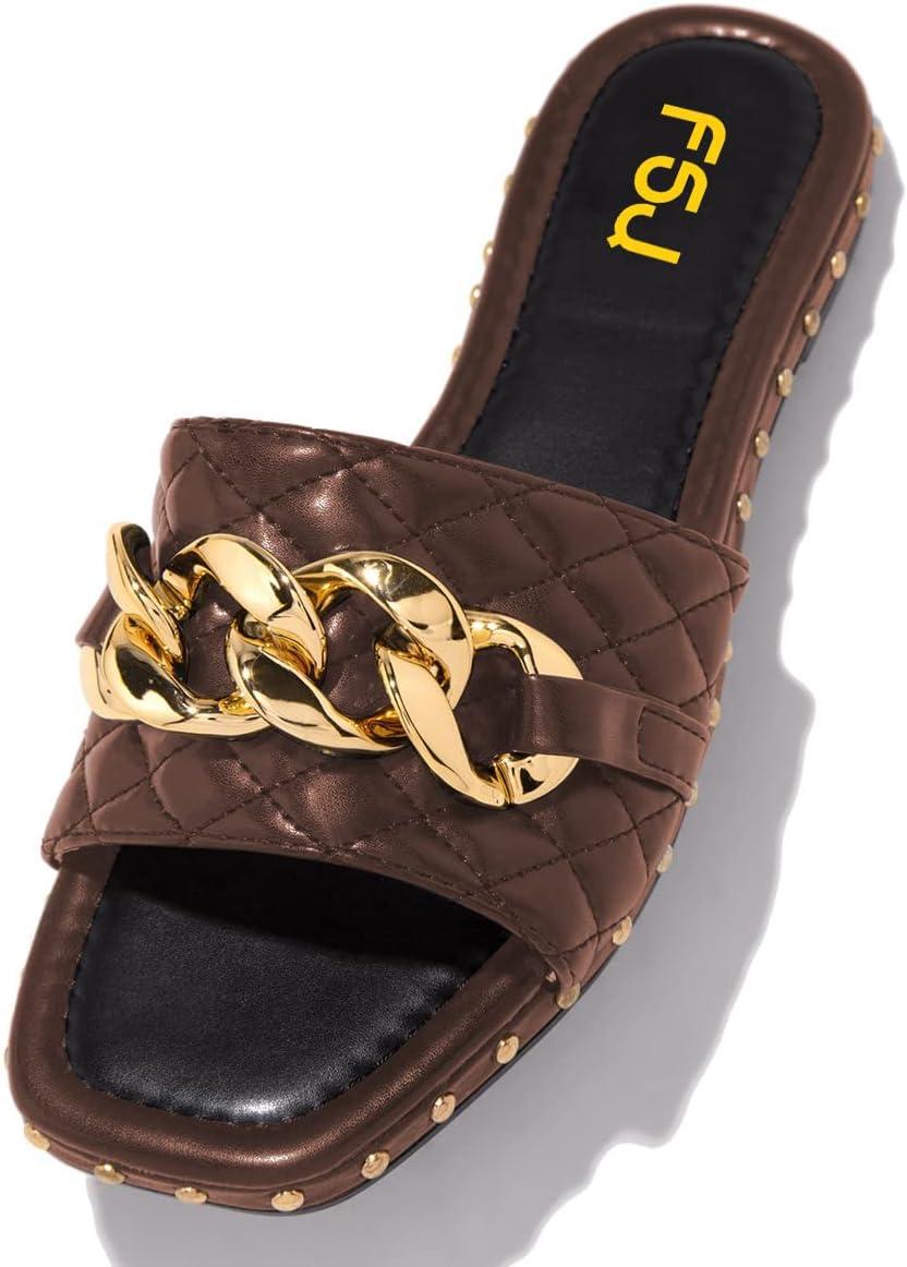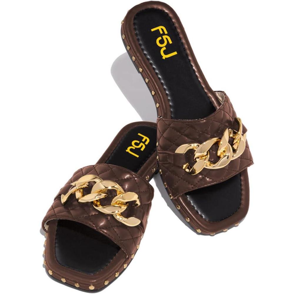 Save up to 40% on FSJ Women Sexy Square Open Toe Comfortable Flat Thick Sole Cushion Sandals Fashion Gold Chain Style Slip On Slides Studded Daily Ladies Summer Shoes Size 4-15 US(Brown) styles during our end-of-season sale.