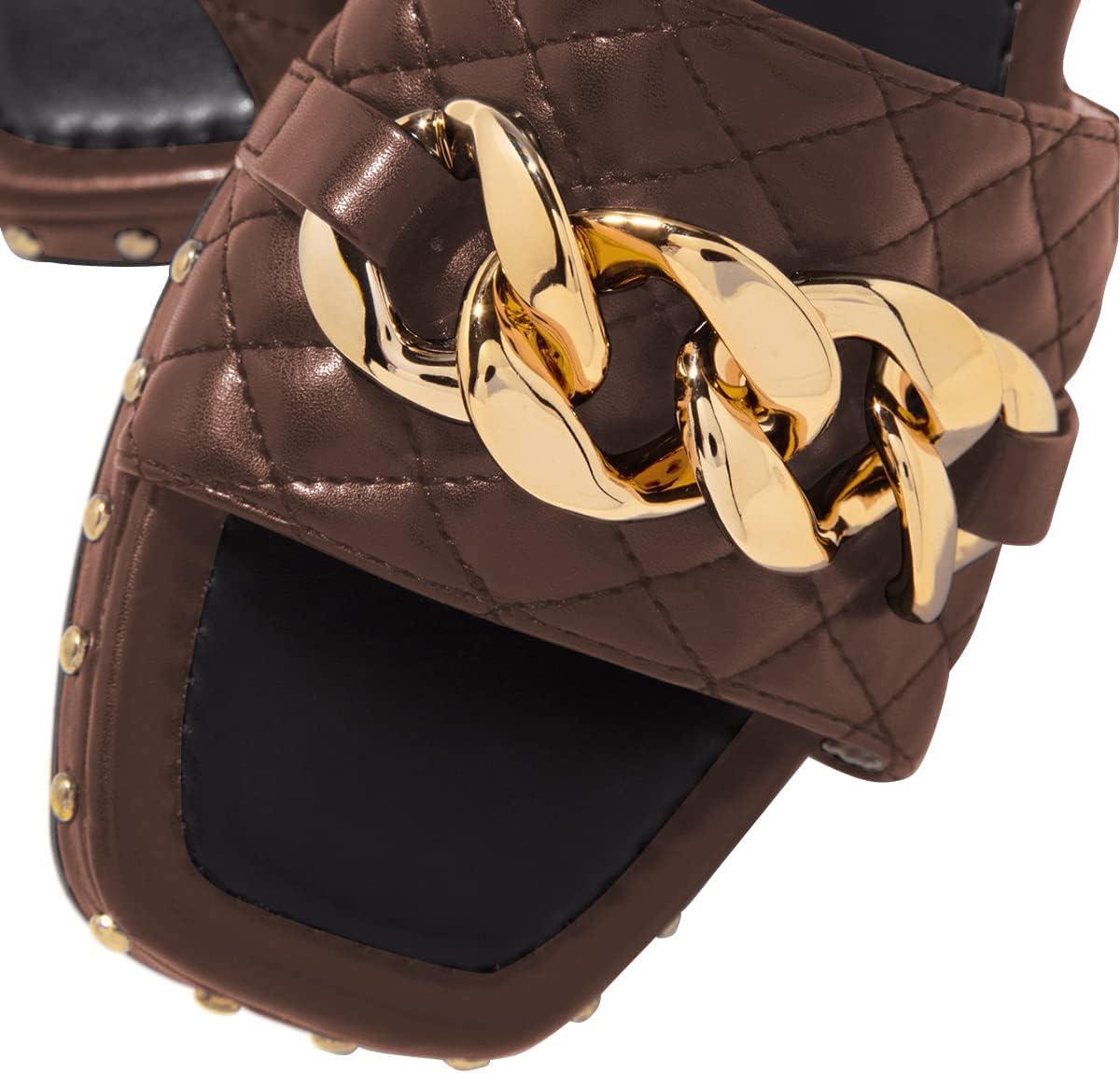 FSJ Women Sexy Square Open Toe Comfortable Flat Thick Sole Cushion Sandals Fashion Gold Chain Style Slip On Slides Studded Daily Ladies Summer Shoes Size 4-15 US(Brown)