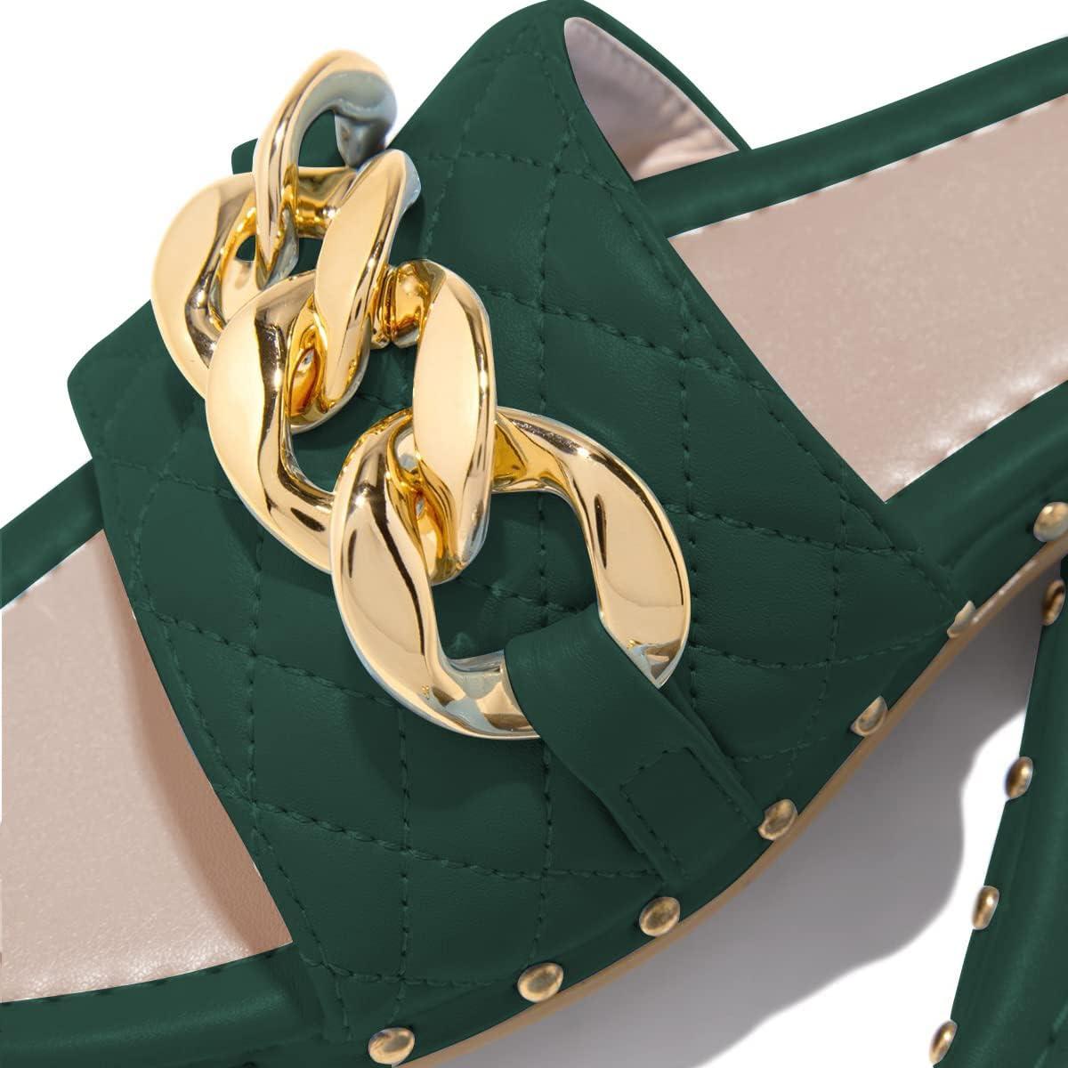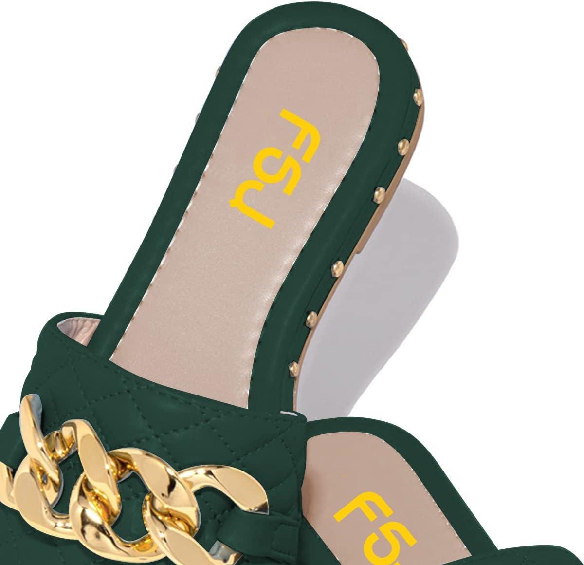 FSJ Women Sexy Square Open Toe Comfortable Flat Thick Sole Cushion Sandals Fashion Gold Chain Style Slip On Slides Studded Daily Ladies Summer Shoes Size 4-15 US(Darkgreen)