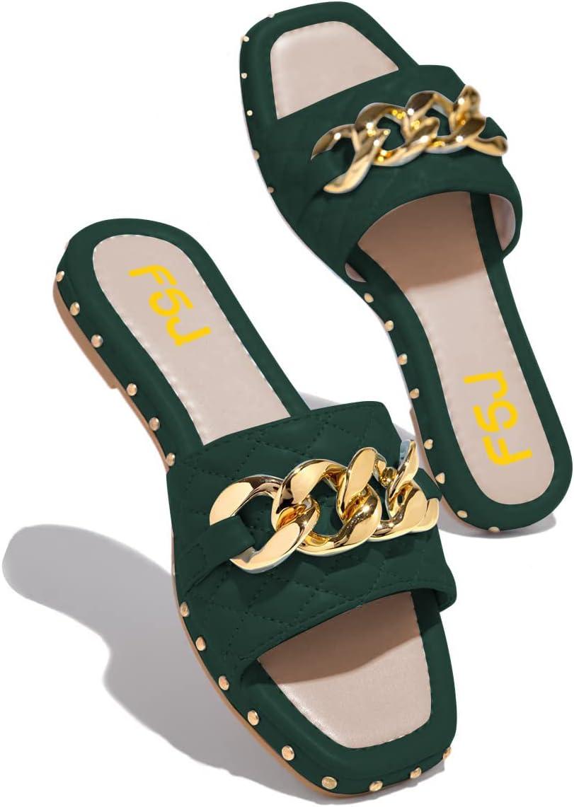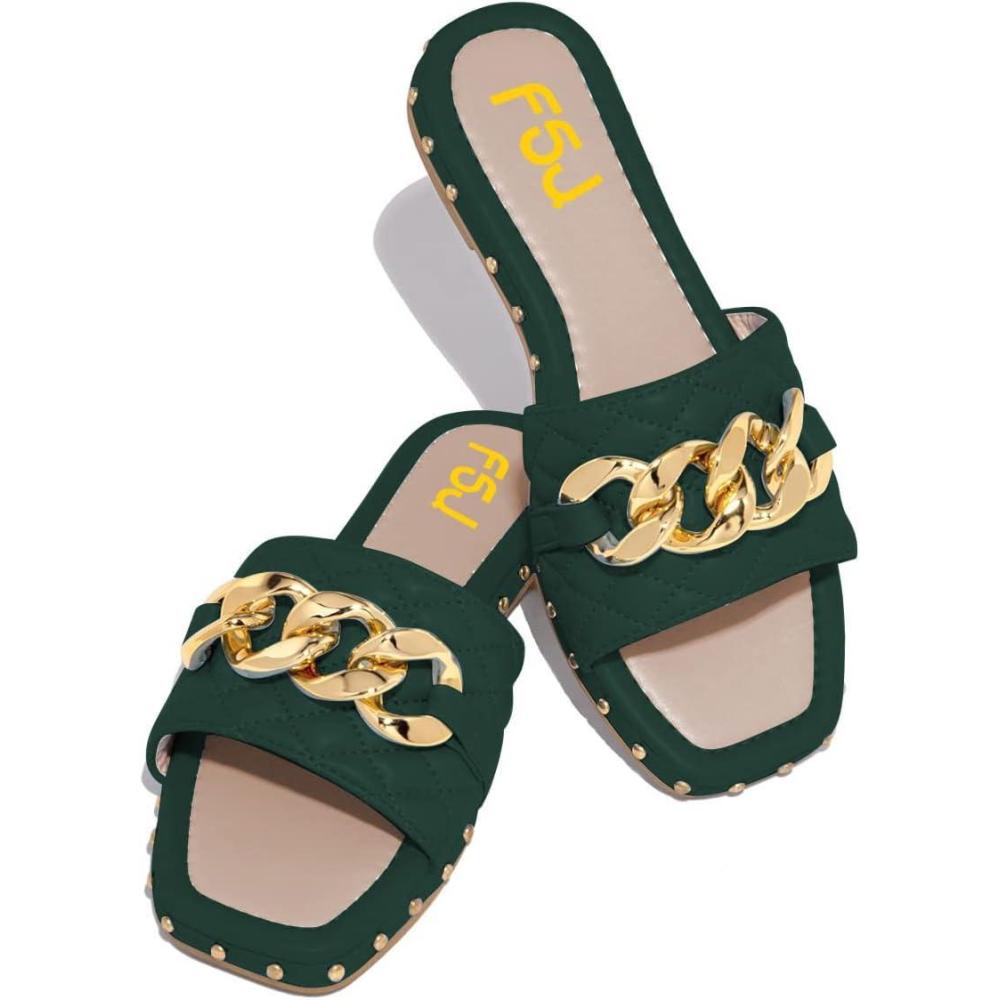 FSJ Women Sexy Square Open Toe Comfortable Flat Thick Sole Cushion Sandals Fashion Gold Chain Style Slip On Slides Studded Daily Ladies Summer Shoes Size 4-15 US(Forest Green)