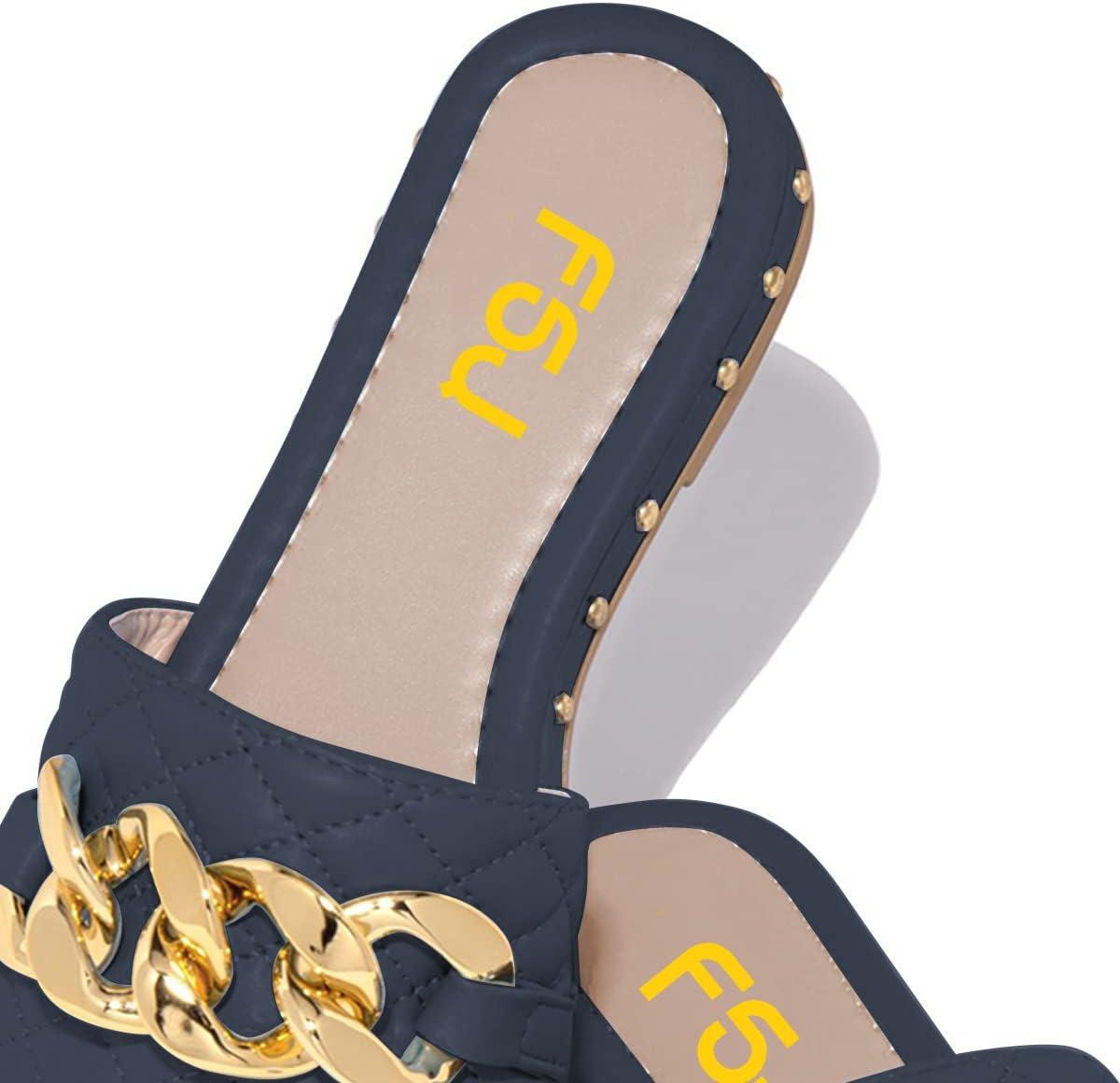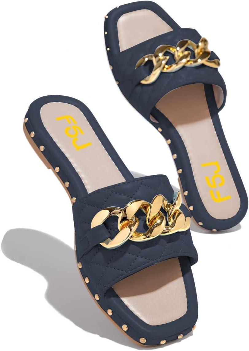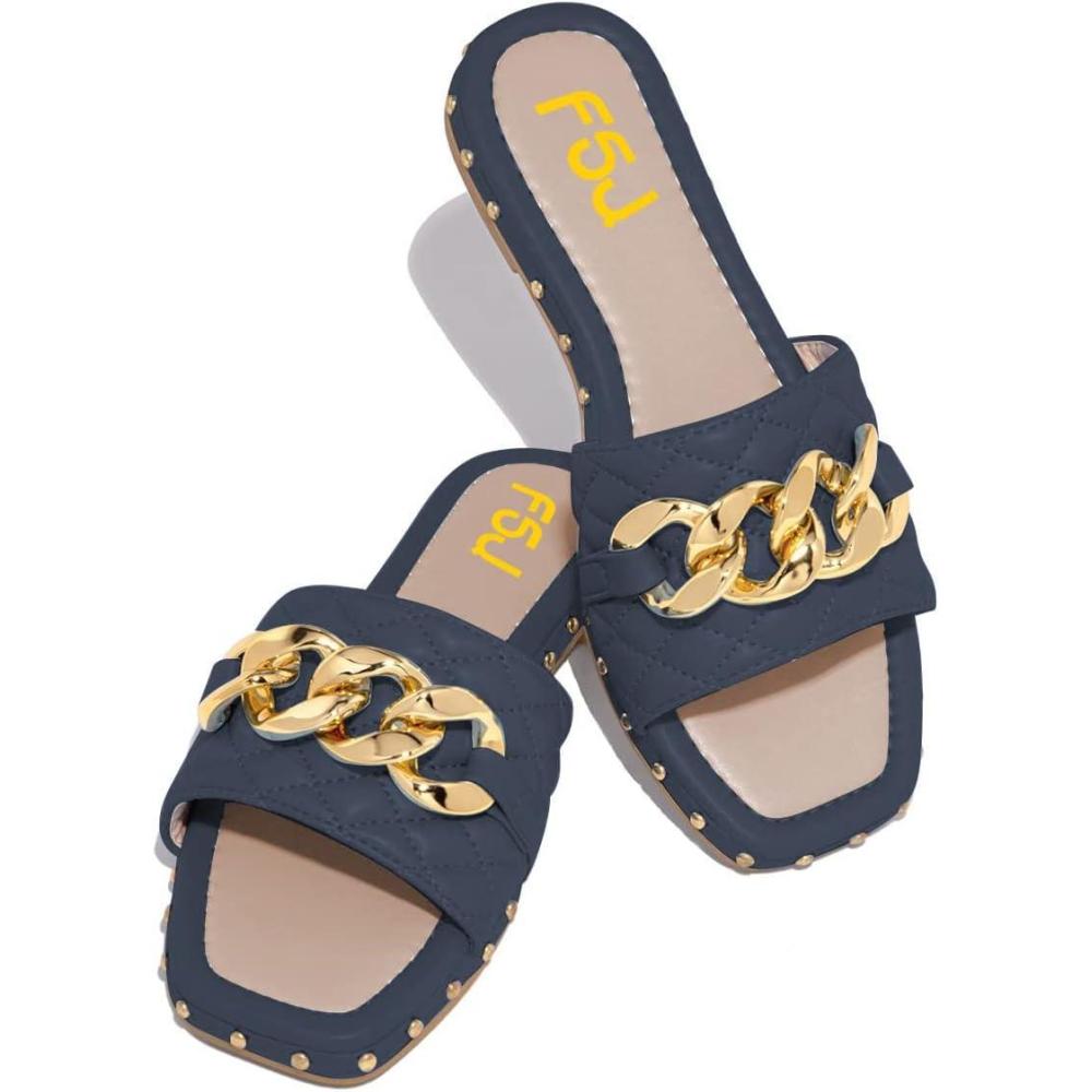 Don’t wait, get up to 50% off on FSJ Women Sexy Square Open Toe Comfortable Flat Thick Sole Cushion Sandals Fashion Gold Chain Style Slip On Slides Studded Daily Ladies Summer Shoes Size 4-15 US(Navyblue) during our end-of-season sale event.