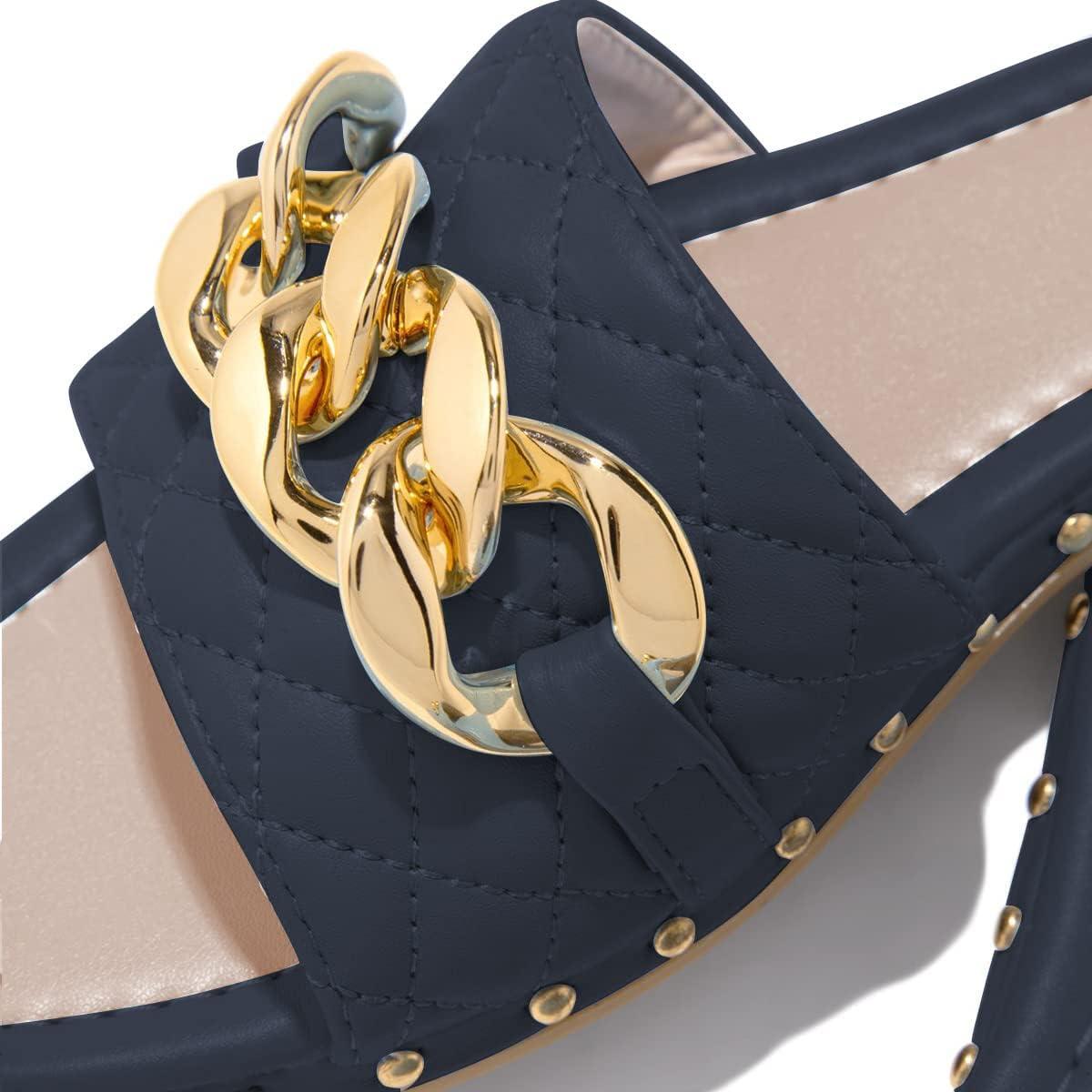 imageFSJ Women Sexy Square Open Toe Comfortable Flat Thick Sole Cushion Sandals Fashion Gold Chain Style Slip On Slides Studded Daily Ladies Summer Shoes Size 415 USNavyblue