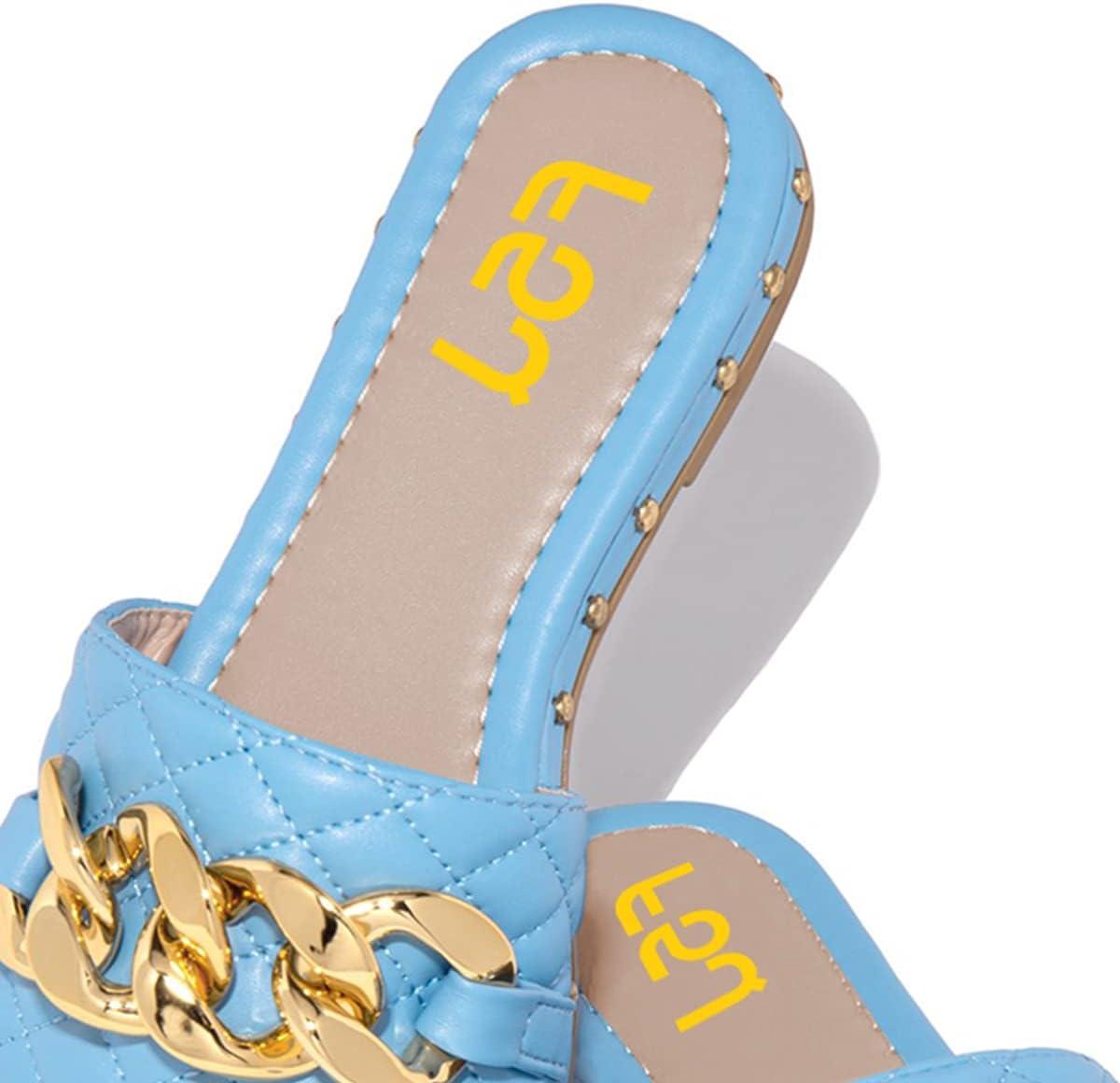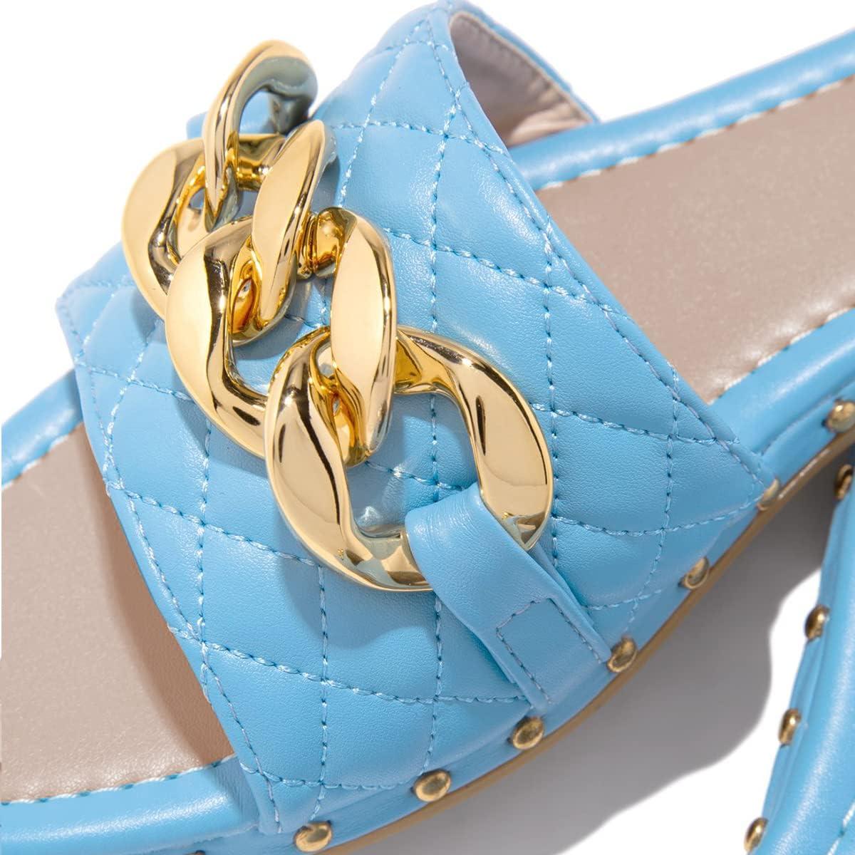 FSJ Women Sexy Square Open Toe Comfortable Flat Thick Sole Cushion Sandals Fashion Gold Chain Style Slip On Slides Studded Daily Ladies Summer Shoes Size 4-15 US(Sky Blue)