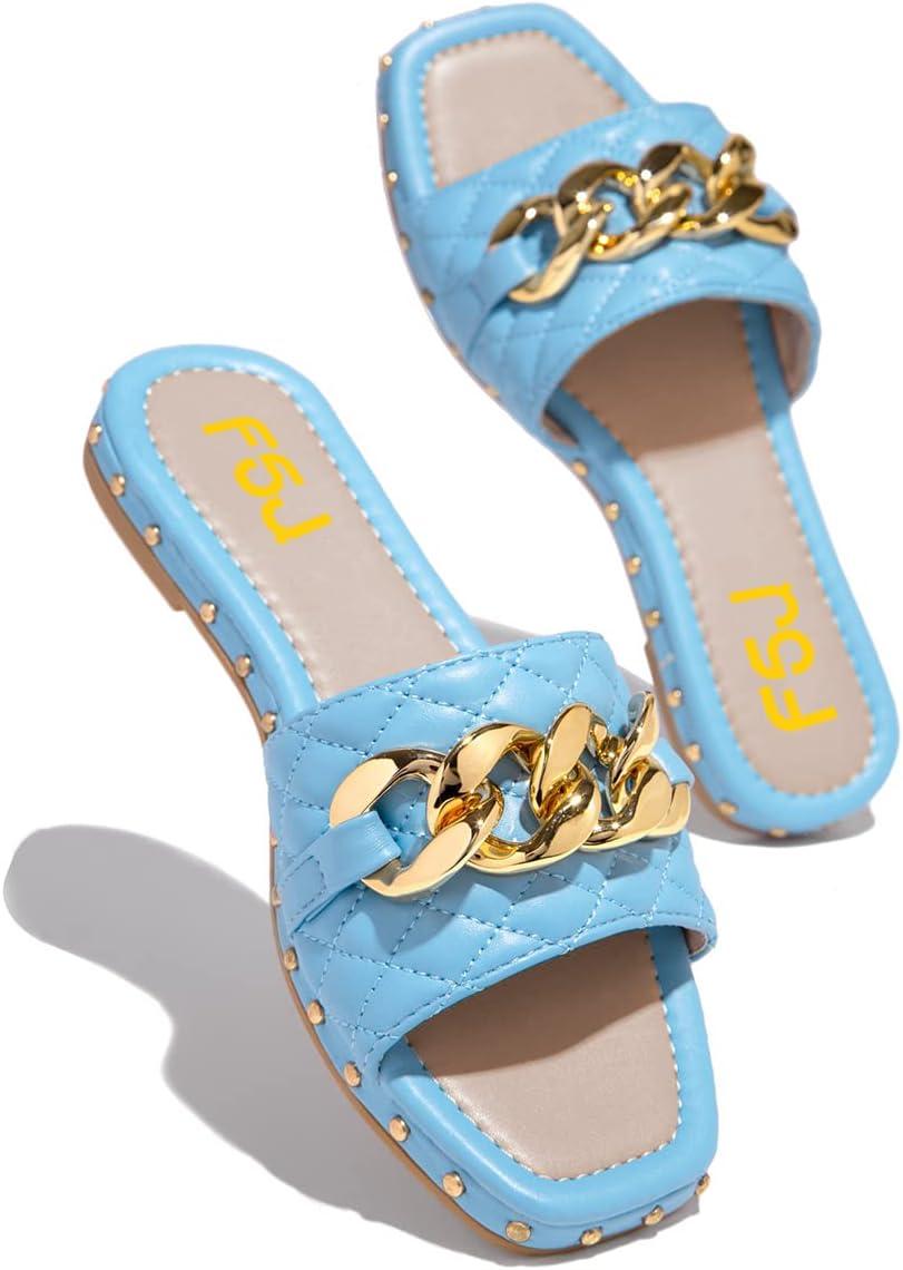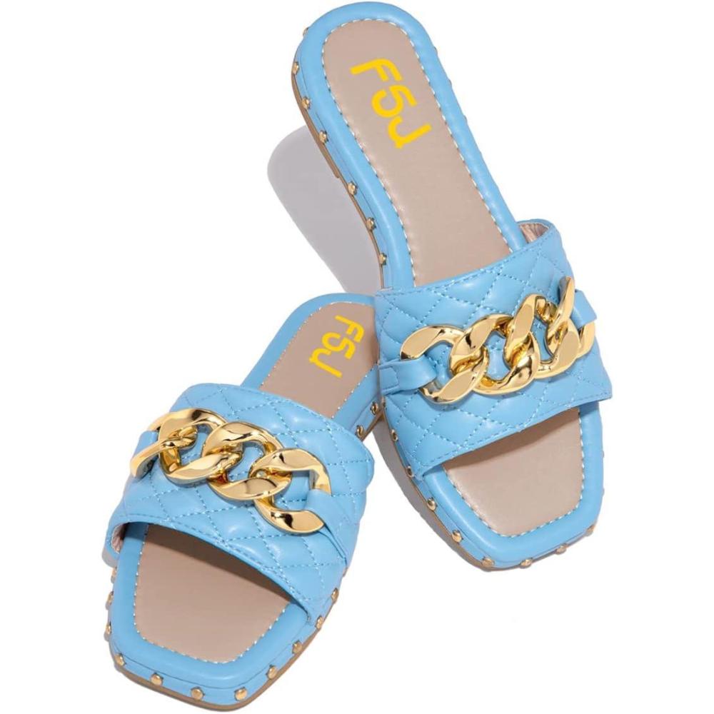Save big on FSJ Women Sexy Square Open Toe Comfortable Flat Thick Sole Cushion Sandals Fashion Gold Chain Style Slip On Slides Studded Daily Ladies Summer Shoes Size 4-15 US(Sky Blue) during our summer blowout sale. Limited quantities available.