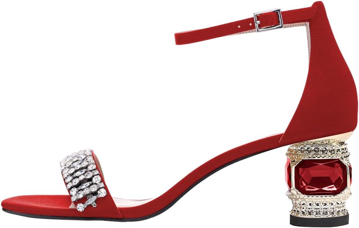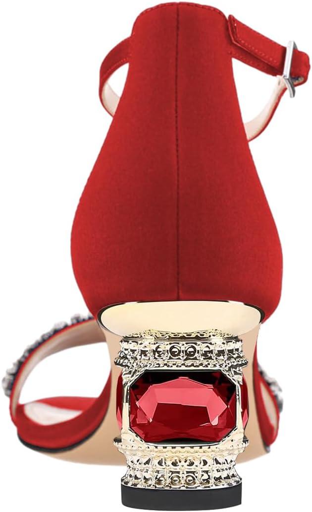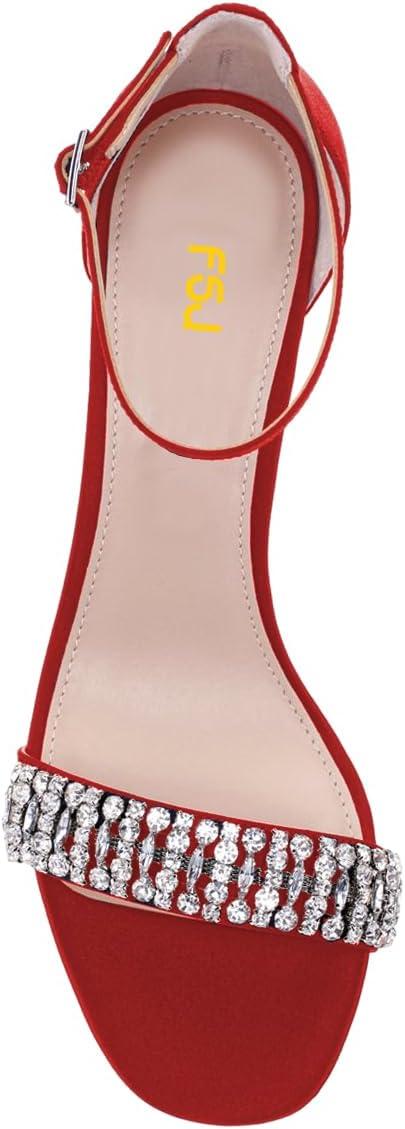 FSJ Women Sparkly Open Toe Rhinestone Low Block Heel Sandals Crystal Strap Studded Strappy Formal Dress Prom Party Pump Shoes Size 4-16 US(Red)
