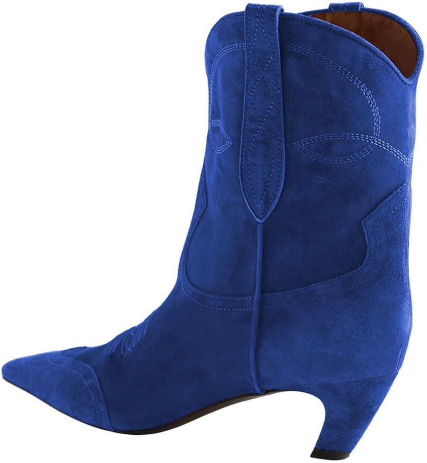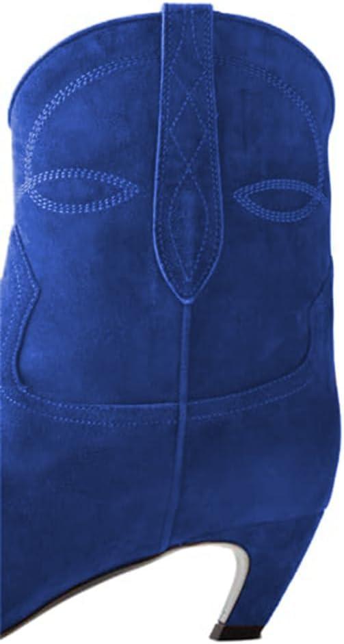 FSJ Women Square Toe Comfort Kitten Low Heel Ankle Boot Pull On Bootie Fall Winter Cowgirl Cowboy Dressy Shoes Size 4-16 US(Blue Suede)