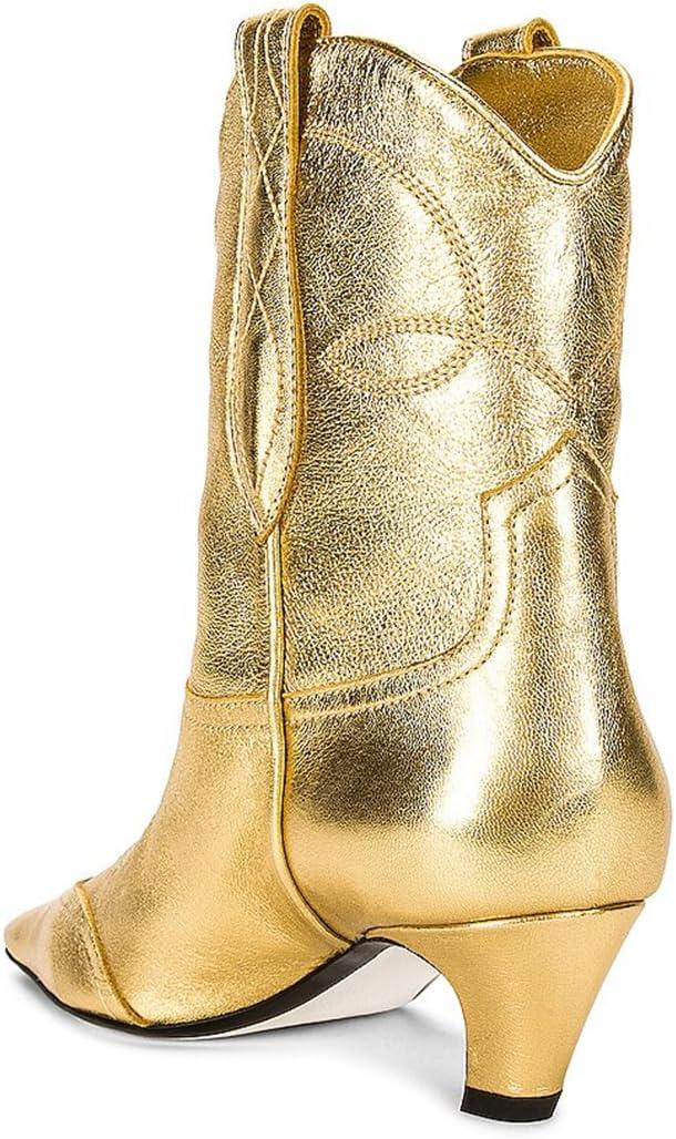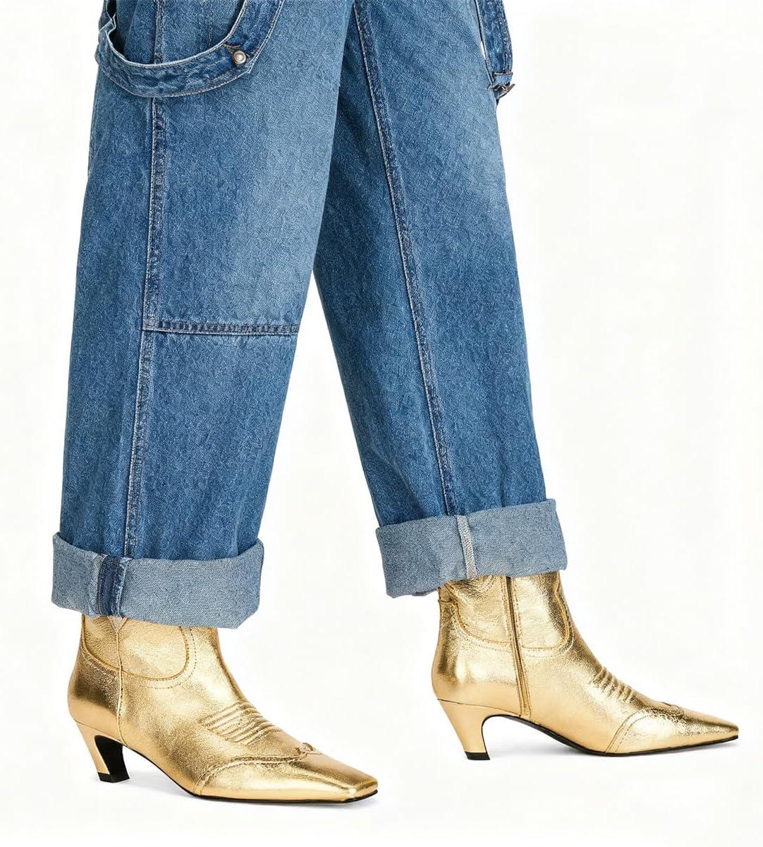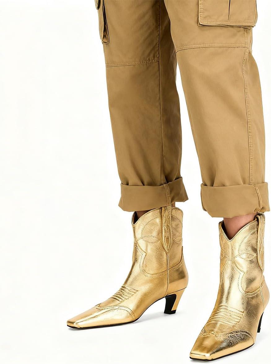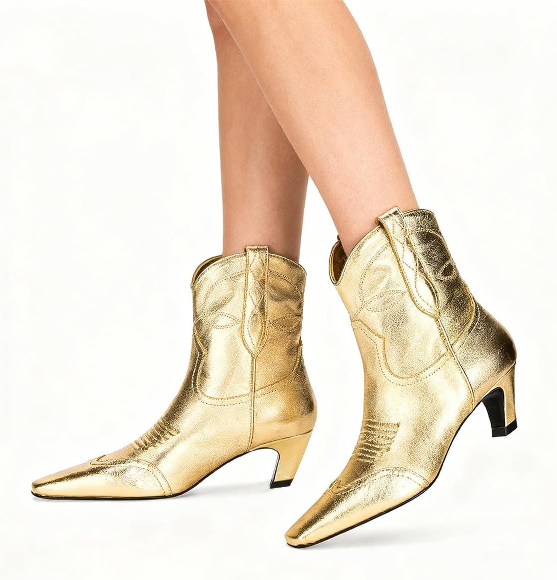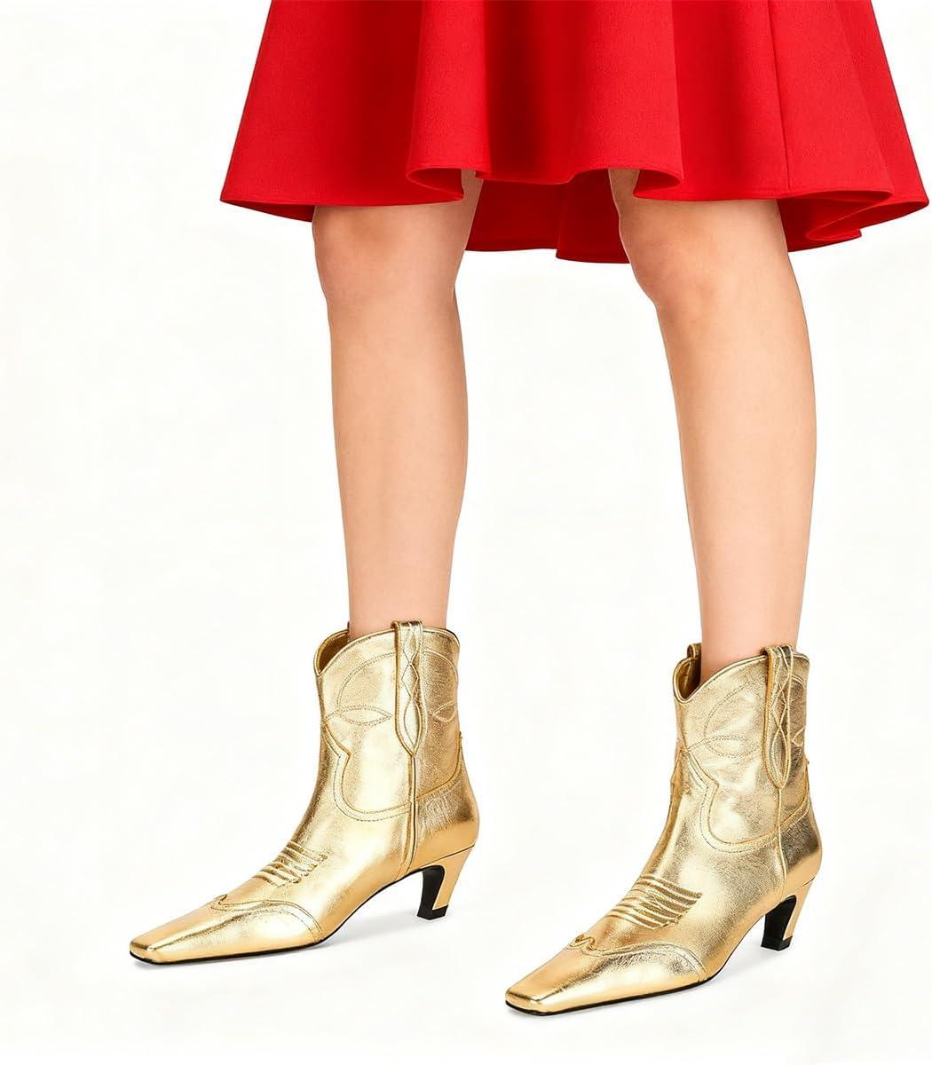 FSJ Women Square Toe Comfort Kitten Low Heel Ankle Boot Pull On Bootie Winter Cowgirl Cowboy Sexy Dressy Shoes Size 4-16 US(Gold)