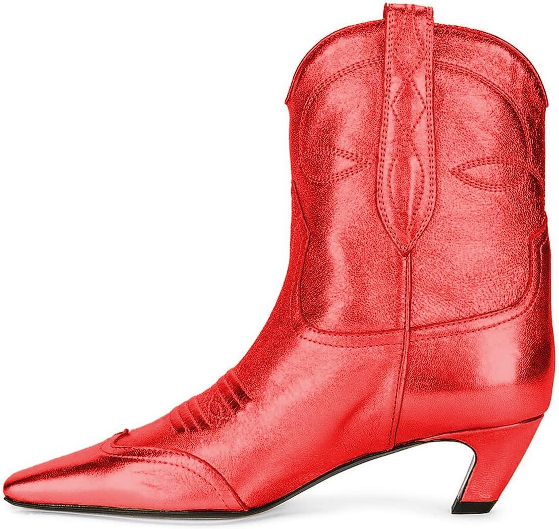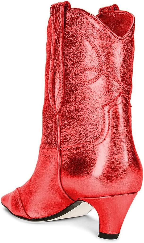 FSJ Women Square Toe Comfort Kitten Low Heel Ankle Boot Pull On Bootie Winter Cowgirl Cowboy Sexy Dressy Shoes Size 4-16 US(Red Metallic Leather)
