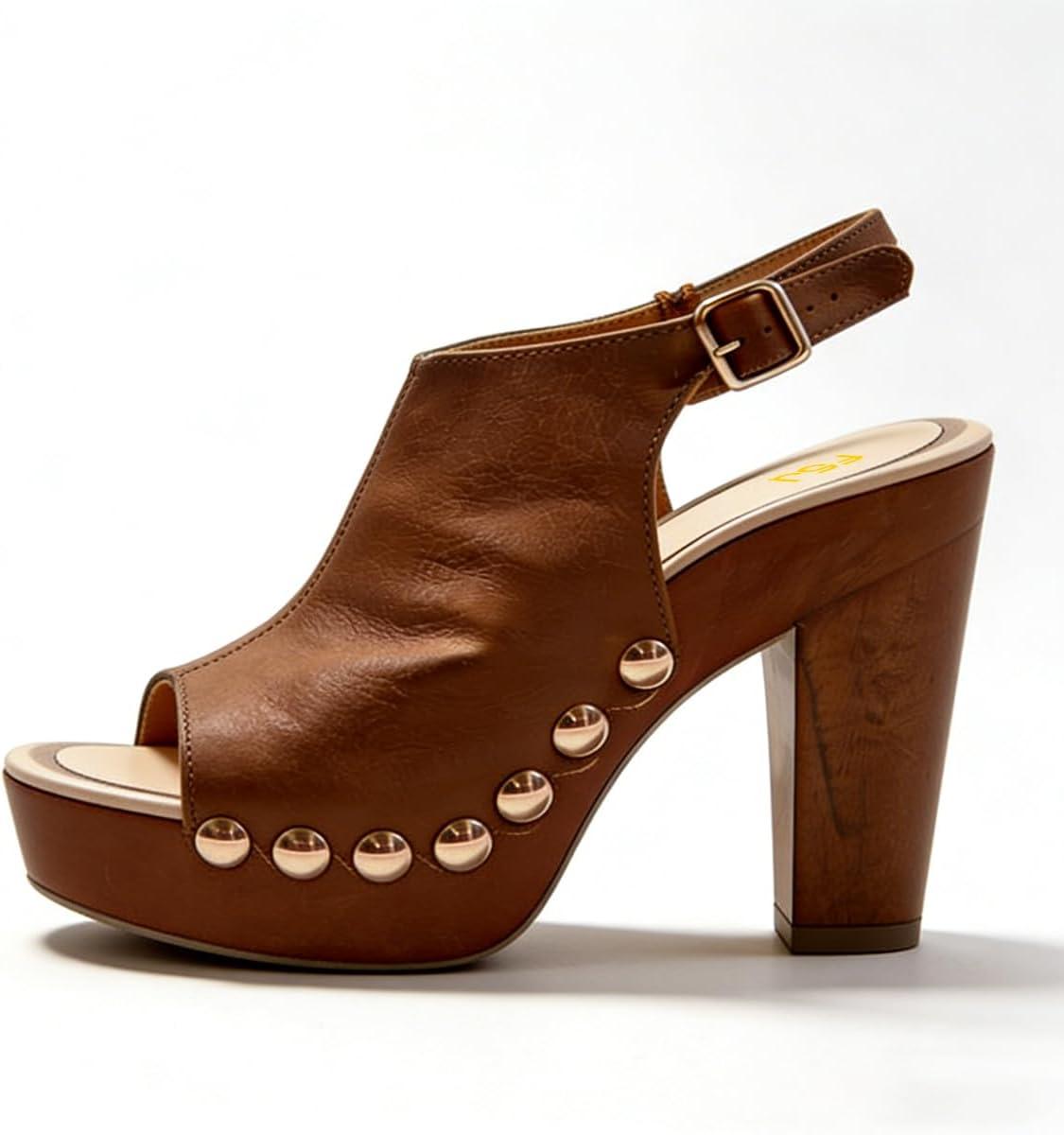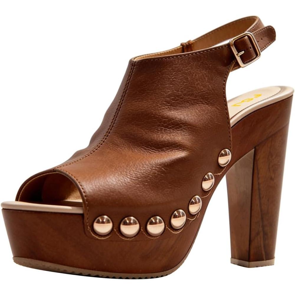 FSJ Women Studded Platform Heels Slingback Sandals Wooden Block Heel Ankle Strap Peep Toe Mules Comfortable Walking Shoes Size 4-16 US(Brown)