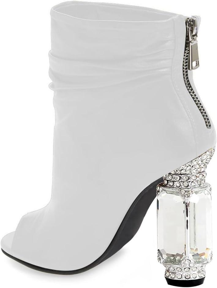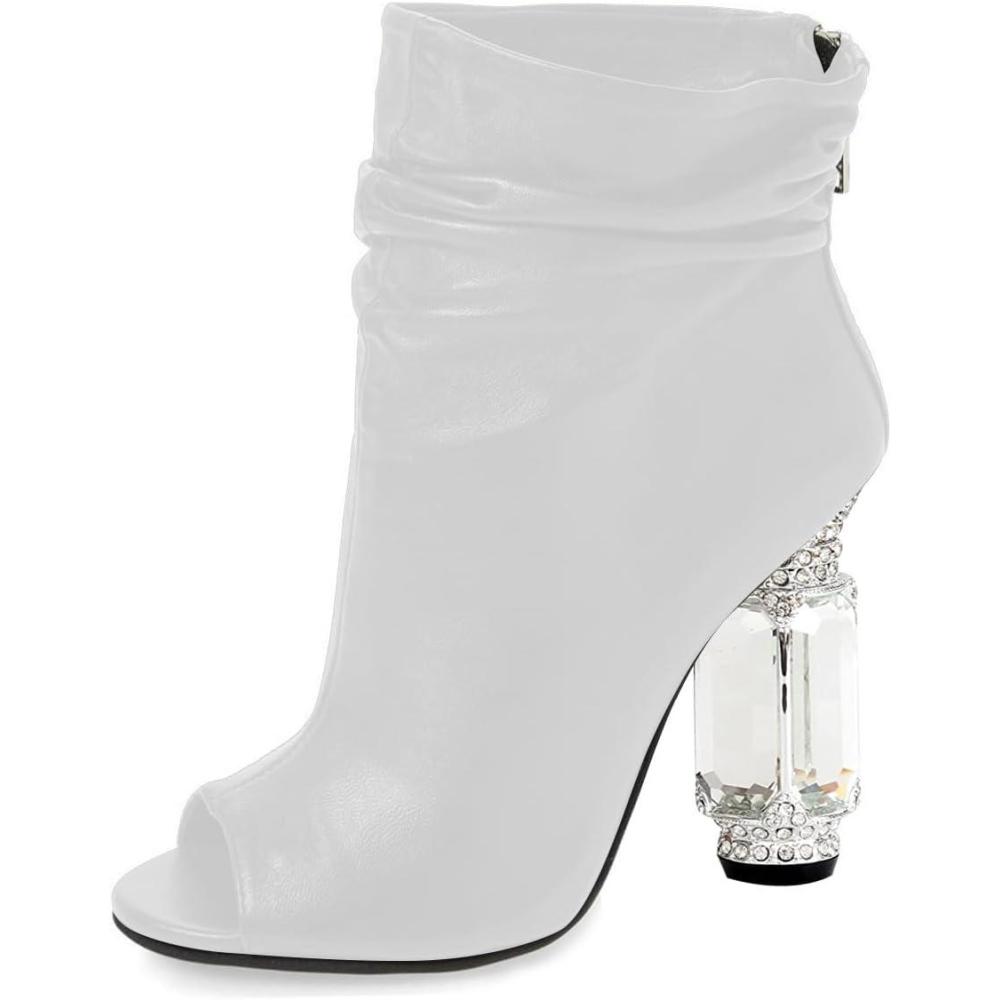 FSJ Women Stylish Peep Toe Slouch Ankle Boots Chunky Stacked Heels Party Prom Nightclub Evening Wedding Crystal Heel Dress Shoes Size 4-15 US(White)