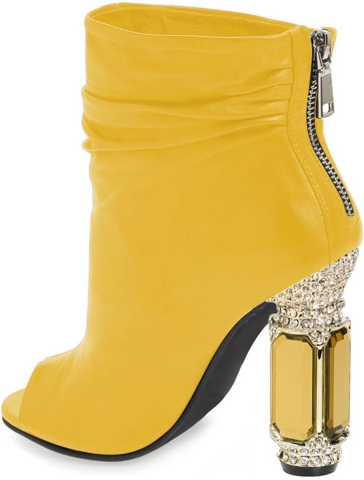 FSJ Women Stylish Peep Toe Slouch Ankle Boots Chunky Stacked Heels Party Prom Nightclub Evening Wedding Crystal Heel Dress Shoes Size 4-15 US(Yellow)