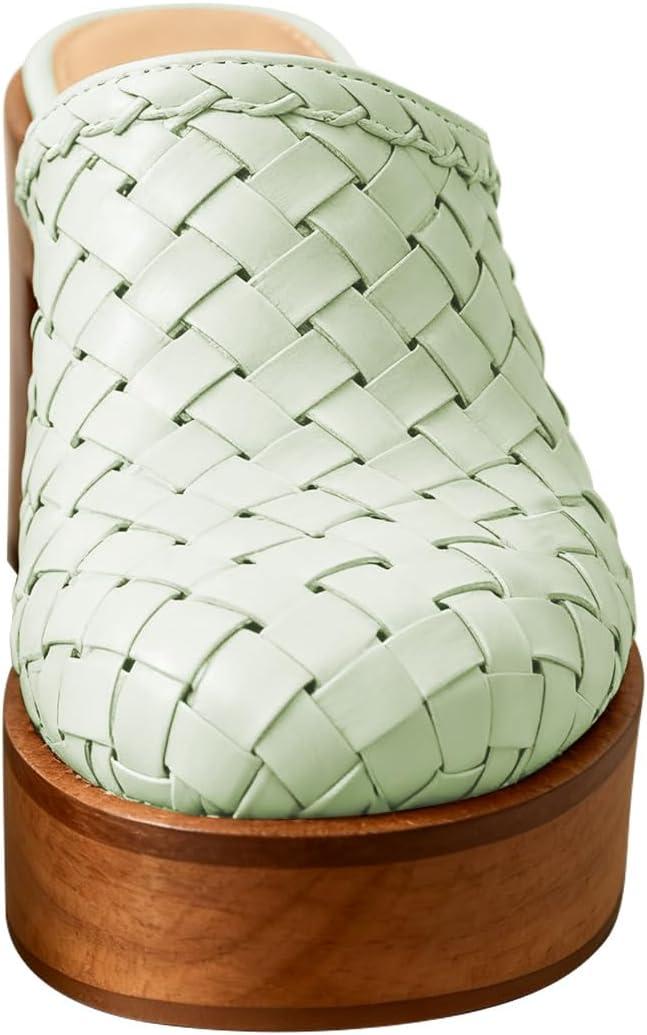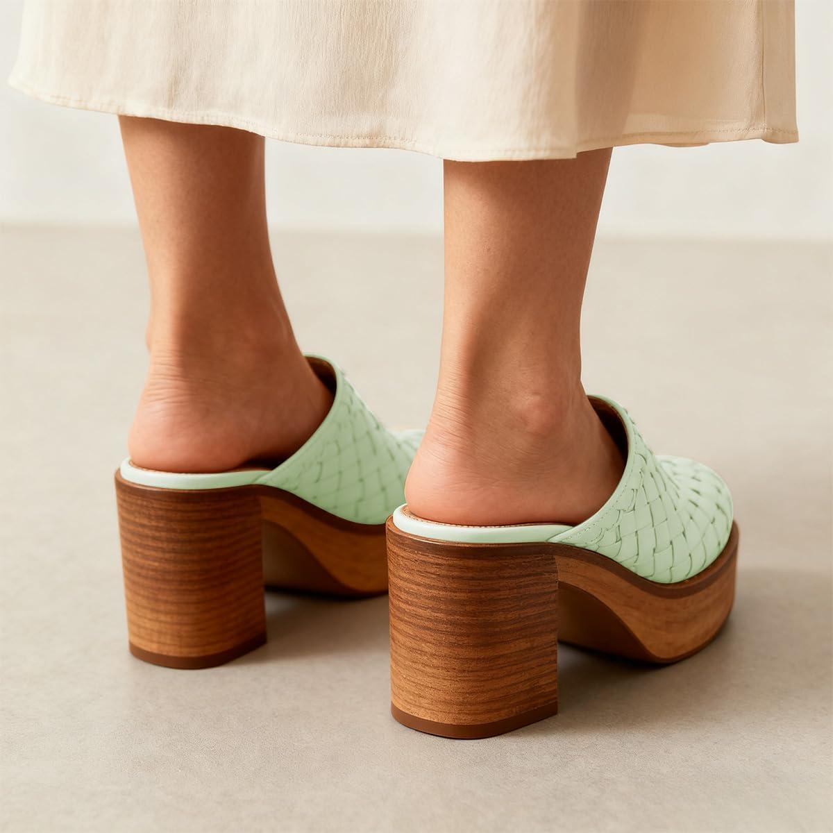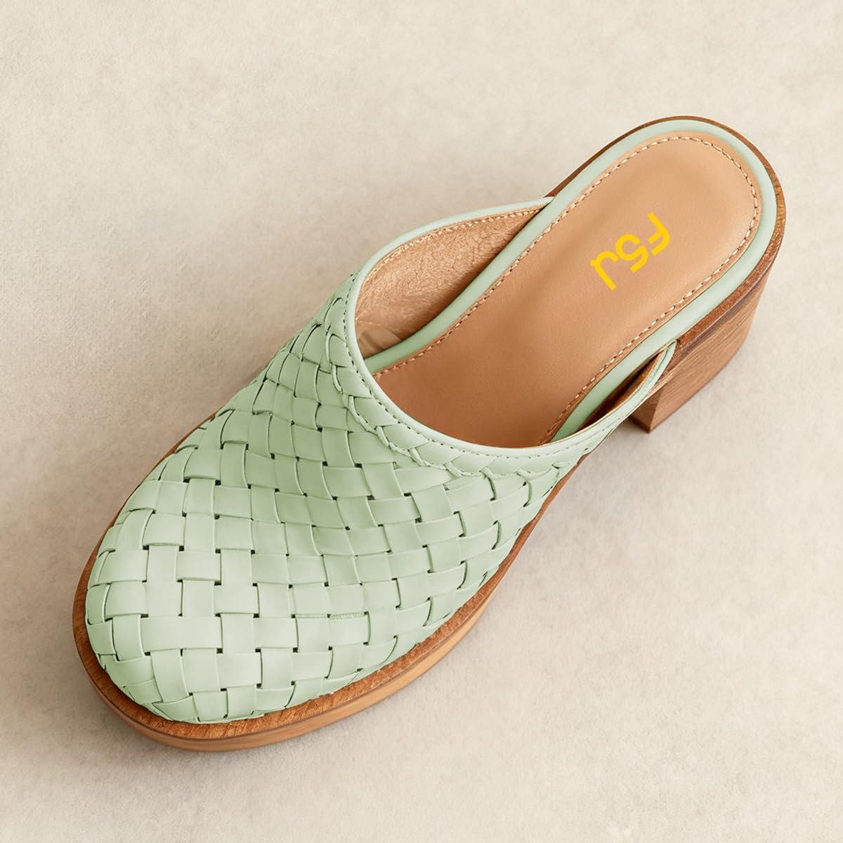 FSJ Women Woven Platform Mules Wooden Chunky High Heel Slip On Clogs Closed Toe Heeled Sandals Comfortable Casual Shoes Size 4-16 US(Light Green)